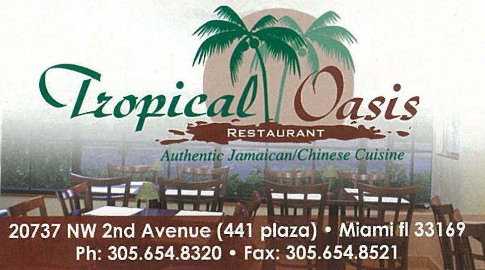 Tropical Oasis is a Jamaican Restaurant and Cafe located in Miami Gardens Florida. Call 305-654-8320.. The restaurant is one of the top Jamaican Restaurant in this area - established for more than 3 decades... offering among the best tasting foods in Miami Gardens Florida.
